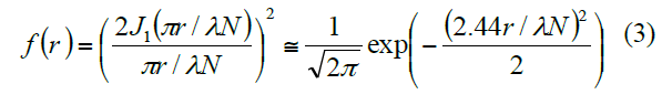 我們正在測量一個比距離 D 小的器件寬度。因此,這是一個亞衍射極限特征。這個系數來自于從點源發出的能量譜作為距離的函數。圖6中的艾里盤確定了能量譜在貝塞爾函數輪廓中為零的距離極限,這是以點源為中心的距離函數 [9]。這個能量輪廓在艾里盤內可以用高斯輪廓近似擬合,其系數為 2.44,這便于進一步的數學處理。從點源沿距離的能量譜可以描述為: